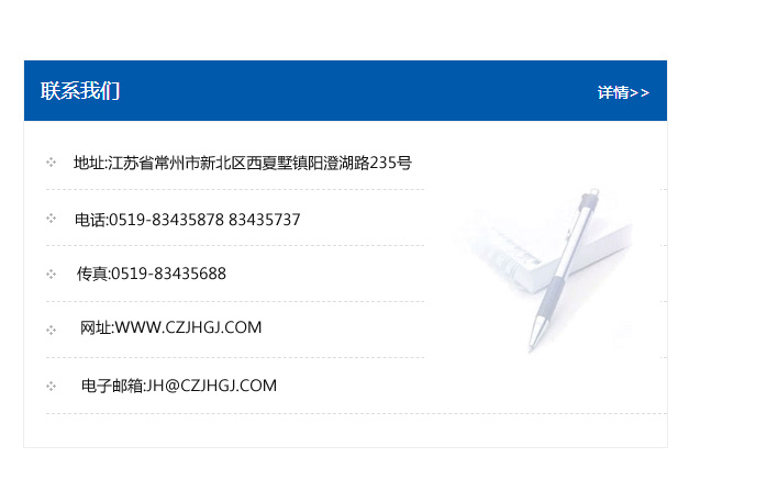 地址:常州市新北區友邦商務大廈1幢16、17層  電話:0519-85101652  傳真:0519-85112595  郵編:213022  網址:www.cz-jiayue_cn.xianyihai.com  郵箱:xiajifengaa@163.com